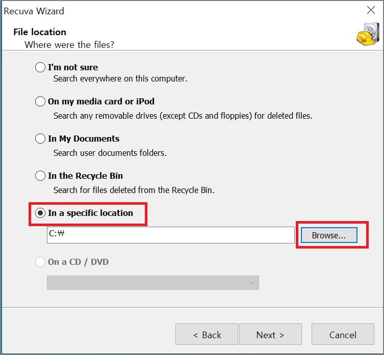 삭제한 드라이브를 선택해 주세요. USB를 복구할 경우 특정위치를 선택하고 Browse... 를 클릭합니다.