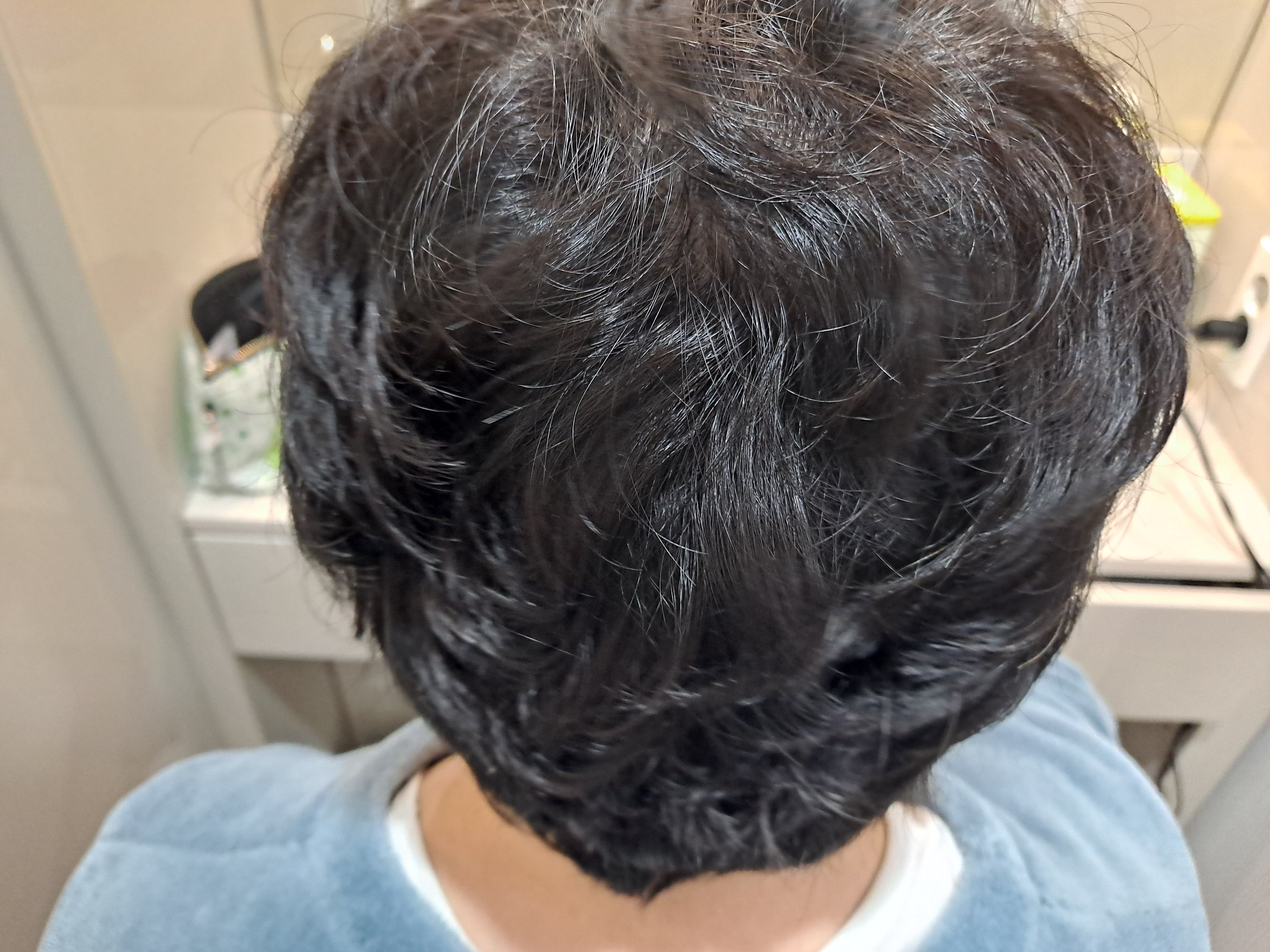 남편은 생머리에 윗머리는 숫이 평범하고 뒷머리는 숫이 많아요. 머리카락이 가늘고 생머리인 경우 파마가 잘 안 나오기 때문에 시간을 좀 더 길게 해줘야 합니다. 뒷머리에 숫이 많아서 파마를 하니 머리가 무거워 보이네요. 미용실에서 머리 자르고 파마하는 이유가 있나 봅니다.
